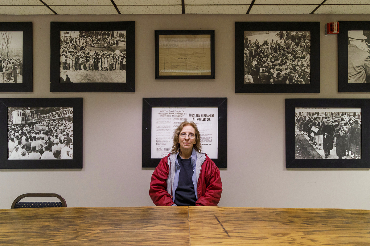 Cindy Hering, mother of Courtney Hering, sits inside the UAW Local 833 union hall in Sheboygan, Wis. She has worked in the Kohler plant for nearly 40 years.