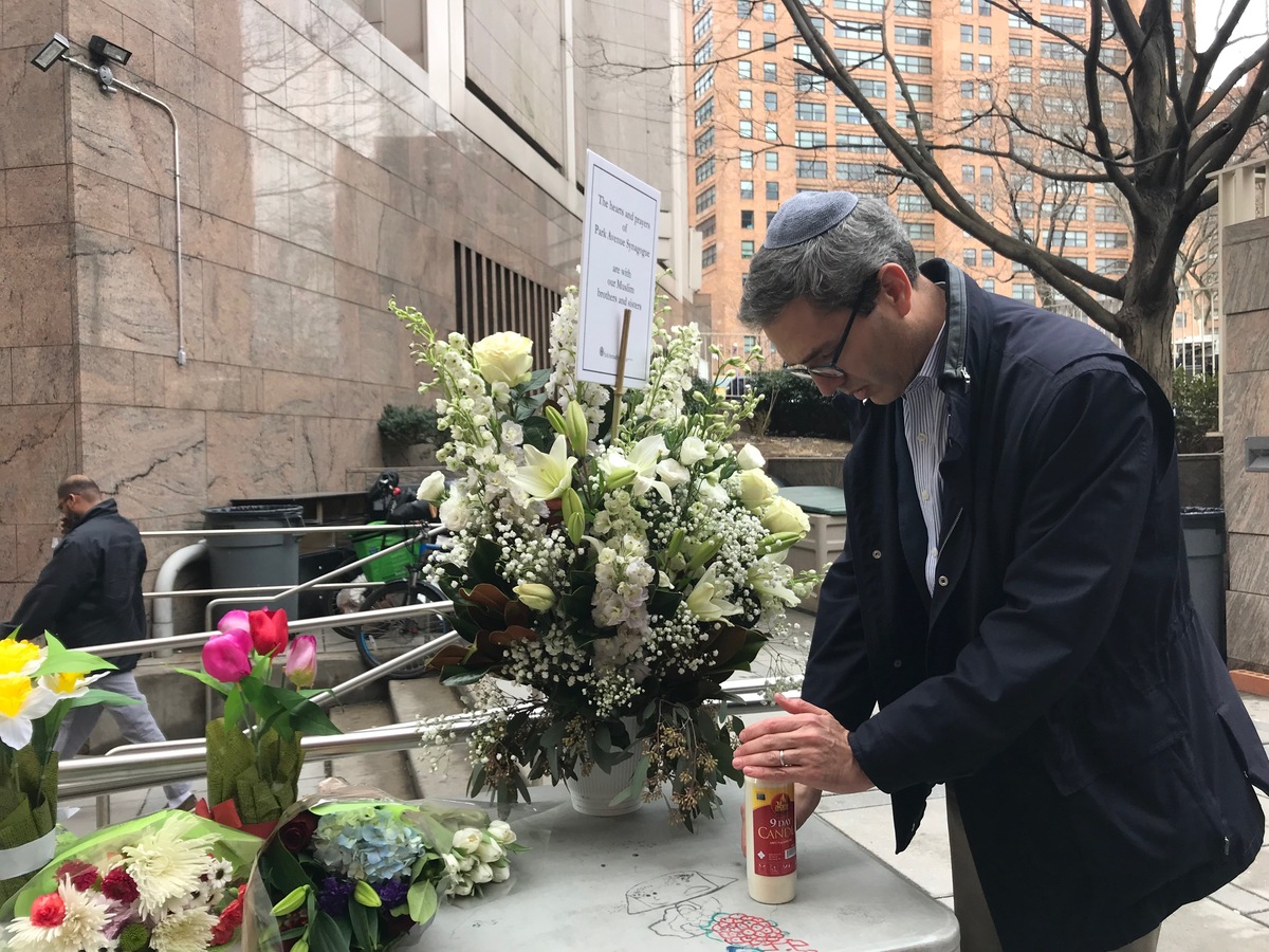 Rabbi Elliot Cosgrove of the nearby Park Avenue Synagogue bought a massive bouquet of white flowers. He said his congregation hasn’t forgotten at the mass shooting at a synagogue in Pittsburgh last year.