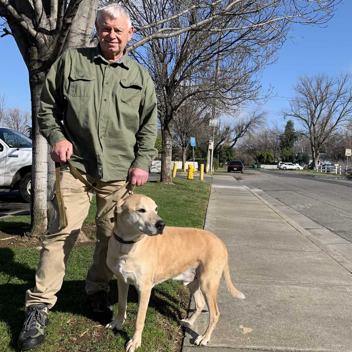 Brian Grahlman and his dog Scout narrowly escaped the Camp Fire. His home in Paradise was destroyed and for now is living with his daughter in Chico.