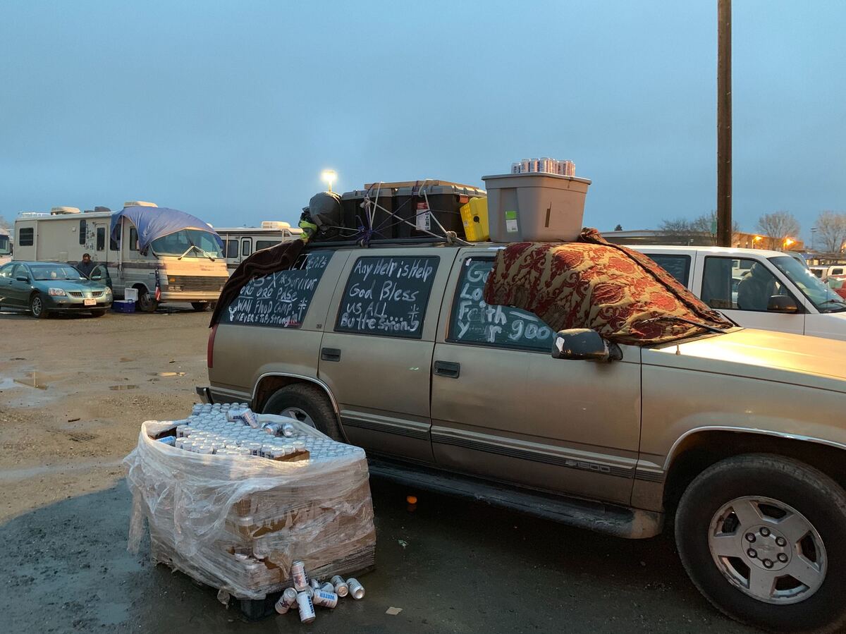 A message, written in white spray paint on a car window, says ‘any help is help.’ The car sits in the parking lot of a shelter in Chico where, more than two months after the fire, 700 victims still live.