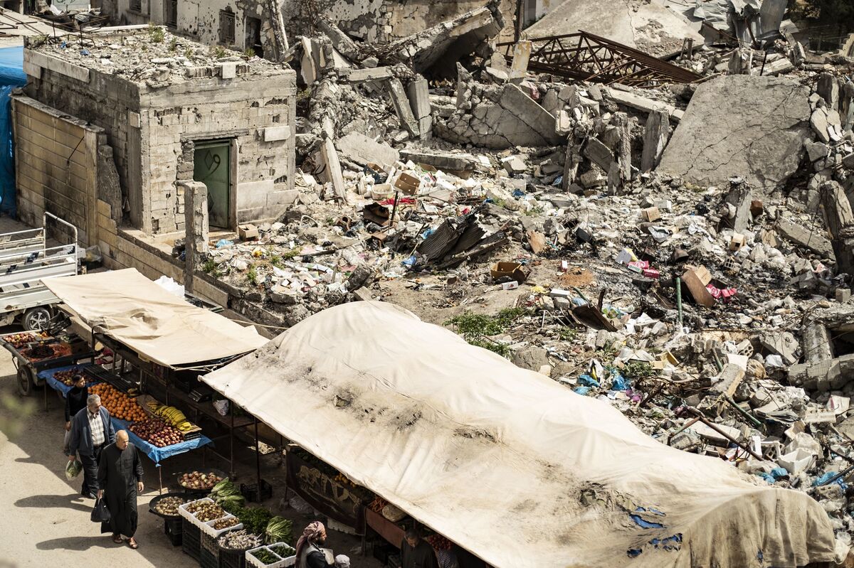 Customers walk near makeshift fruit and vegetable shops set in front of destroyed buildings in the northern Syrian city of Raqqa earlier this month.