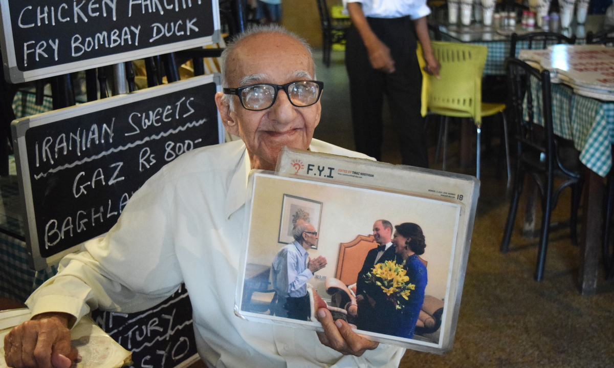 Boman Kohinoor, 97, has spent the last eight decades committed to his beloved Britannia and Co, one of Mumbai’s last Parsi cafés. Here, he proudly holds up a photo of himself with two members of the British royal family: the Duke and Duchess of Cambridge, Prince William and the former Kate Middleton.