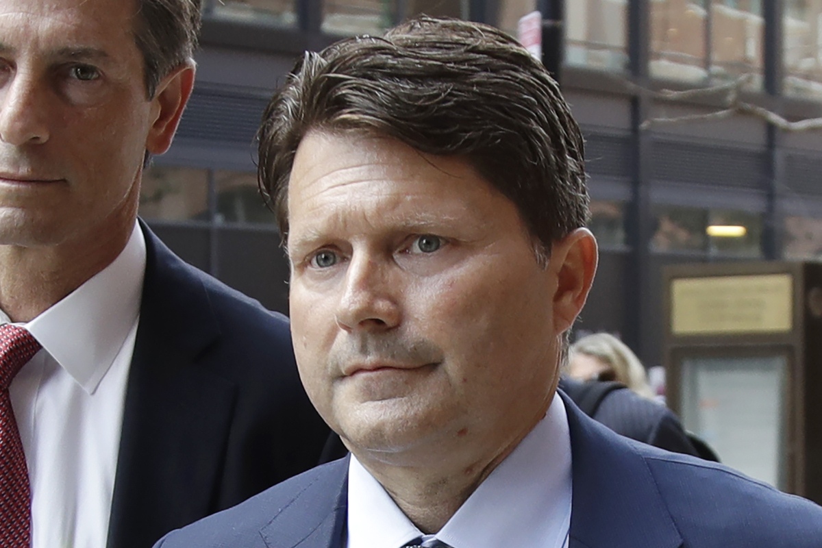 Devin Sloane, right, arrives at federal court in Boston for sentencing in a nationwide college admissions bribery scandal, on Tuesday. Sloane admitted to paying $250,000 to get his son into the University of Southern California as a water polo player.