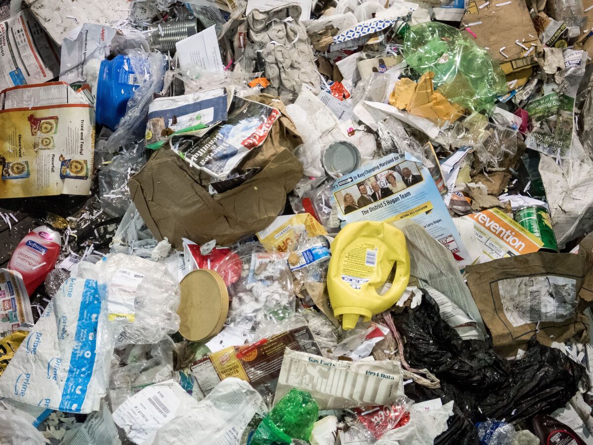 Recycling material moves along a conveyor belt to be sorted at Waste Management’s Material Recovery Facility in Elkridge, Md. In 2018, China announced it would no longer buy most plastic waste from places like the U.S.