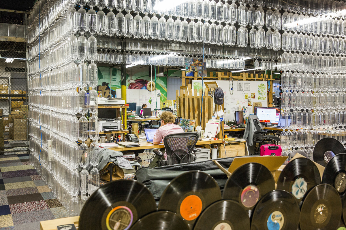 Plastic bottles surround an employee at a work station inside recycling company TerraCycle’s headquarters in Trenton, N.J., in 2017.