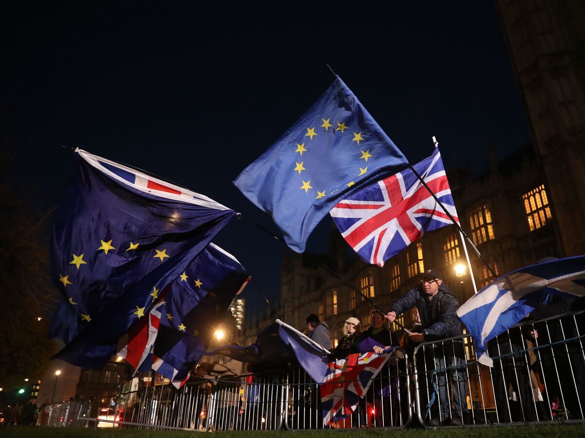 Anti-Brexit campaigners wave the Union Jack and European Union flags outside the Houses of Parliament on Wednesday.