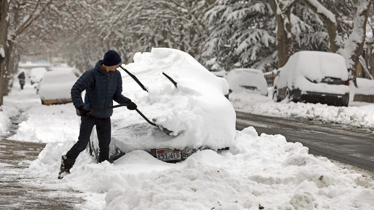Landon Ainge digs his car out of the snow on Wednesday in Salt Lake City, where a heavy snowfall triggered a rare snow day for many students.